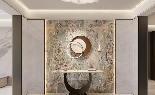 設(shè)計(jì)理念 輕法式風(fēng)格以“減法美學(xué)”為核心,摒棄傳統(tǒng)法式的繁復(fù)雕花,通過(guò)對(duì)稱布局、淡雅色調(diào)和幾何線條傳遞優(yōu)雅氣質(zhì)。空間設(shè)計(jì)注重功能與美學(xué)的統(tǒng)一,例如客廳采用對(duì)稱式沙發(fā)布局,搭配弧形元素弱化線條的冷硬感,強(qiáng)化家庭互動(dòng)性。材質(zhì)選擇上,天然石材、絲絨與金屬的碰撞,既保留法式古典的厚重感,又賦予現(xiàn)代輕奢的精致氣息。 核心元素 ??石膏線條與拱形結(jié)構(gòu)?:墻頂面通過(guò)雕花燈盤(pán)、石膏角花等細(xì)節(jié)營(yíng)造法式儀式感,拱形壁龕設(shè)計(jì)可柔化空間邊界,增強(qiáng)視覺(jué)通透性。 ??色彩搭配?:以米白、奶咖等中性色為基底,局部點(diǎn)綴跳色,玄關(guān)采用莫蘭迪粉與奶油色拼接,既清新又顯高級(jí)。 ??材質(zhì)碰撞?:天然大理石、絲絨沙發(fā)與黃銅燈具的組合,通過(guò)紋理對(duì)比提升空間層次;開(kāi)放式廚房采用霧巖板黃銅結(jié)合櫥柜與小吧臺(tái)搭配,兼顧實(shí)用性與藝術(shù)感。 空間布局要點(diǎn) ??功能分區(qū)?:采用玄關(guān)設(shè)置兩側(cè)對(duì)稱工藝玻璃,穿插活動(dòng)空間;客廳與餐廳通過(guò)柔化護(hù)墻板貫通,增強(qiáng)動(dòng)線流暢性。 ??視覺(jué)焦點(diǎn)營(yíng)造?:通過(guò)局部亮點(diǎn)打破單調(diào),例如電視墻采用圓弧形金屬擺放雕塑像,定主題格調(diào)提升;茶室搭配小圓角吊頂與不規(guī)則茶桌,形成趣味對(duì)比。 ??自然采光利用?:大平層需最大化利用270°寬景窗,客廳采用落地窗設(shè)計(jì),搭配法式輕奢窗簾調(diào)節(jié)光線,營(yíng)造溫暖氛圍。 細(xì)節(jié)處理 ??收納設(shè)計(jì)?:針對(duì)業(yè)主生活習(xí)慣,在玄關(guān)、臥室等區(qū)域設(shè)置整面墻衣柜,采用隱形嵌入式設(shè)計(jì)保持視覺(jué)整潔;主衛(wèi)改造為四式分離,內(nèi)帶獨(dú)立化妝間。 ??軟裝搭配?:家具選擇注重線條簡(jiǎn)潔,弧形茶桌、無(wú)拉手柜體;裝飾畫(huà)、壁爐等元素延續(xù)法式浪漫,同時(shí)融入現(xiàn)代功能。