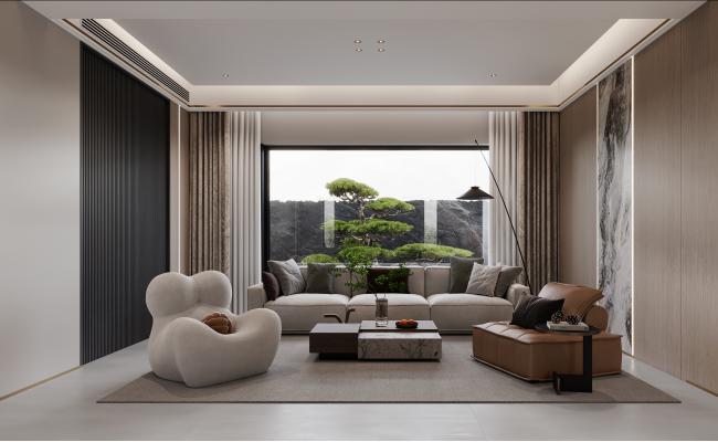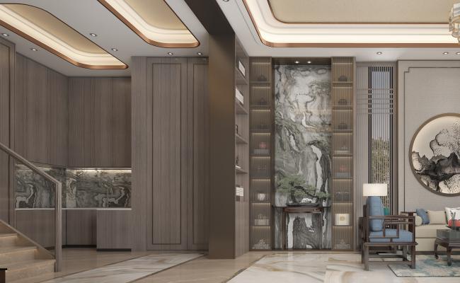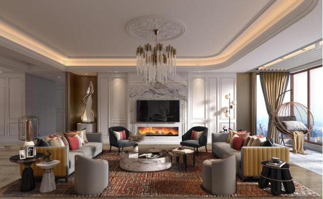 空間以可可蛋奶色系與淺灰為基底,雕花穹頂垂落水晶光瀑。復式層階以弧形曲線延展,鎏金勾邊如凝固的旋律。巖板樓梯與琺瑯玻璃裝飾對話歲月,古董鏡廊折射流動光影。摒棄浮華堆砌,于凡爾賽式骨架中留呼吸之白,終將古典魂靈凝練為當代謐境,成就一處可棲心的精神殿宇。