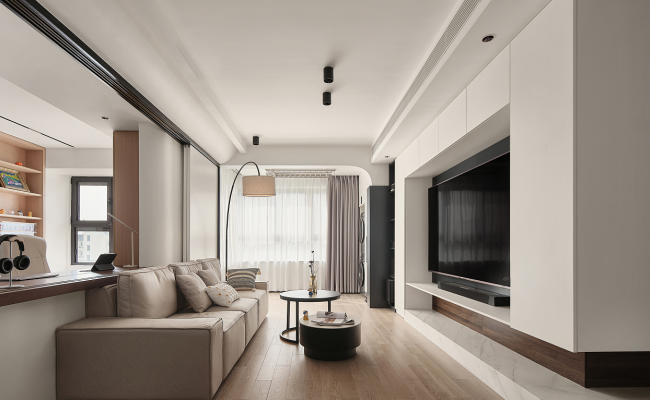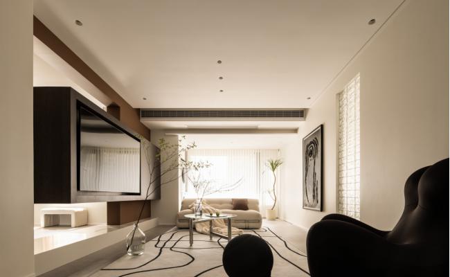 不是被拿來(lái)設(shè)計(jì)的藝術(shù)品 而是純粹生活的有機(jī)體 避開千篇一律的傳統(tǒng)設(shè)計(jì) 節(jié)奏得當(dāng)?shù)目臻g格局 平滑面與凹嵌體相連 一寬一窄,彰顯客廳氣勢(shì) 一高一低,抒發(fā)靈活趣致 呈條狀的木格柵營(yíng)造出 懸浮姿態(tài)的奇妙美感 隨著光影的加深 高密度純色拾取到一絲親切 流露出現(xiàn)代簡(jiǎn)約的美感