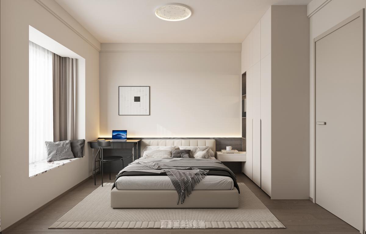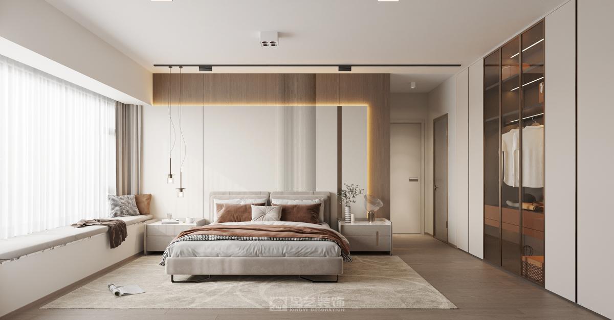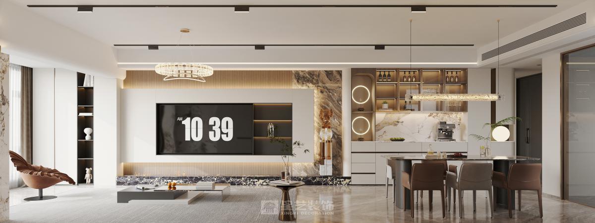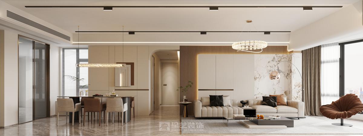 本案客廳主臥整體以輕奢風格,用少量金屬加巖板整體搭配,電視背景更顯歲月流沙質感,讓人眼前一亮,客廳陽臺望江,用了超大推拉窗客廳通鋪設計,可以保留一線江景并且保持通風性,房間也是風格不一且融洽