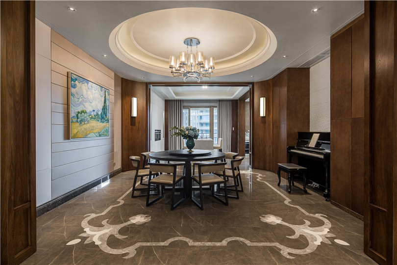 餐廳延續(xù)客廳的設計,橡木與硬包的結合,圓型的吊頂與餐桌上下呼應,家中唯一的一盞大吊燈使餐廳更加敞亮,并賦予了高朋滿座時的歡愉熱鬧。
