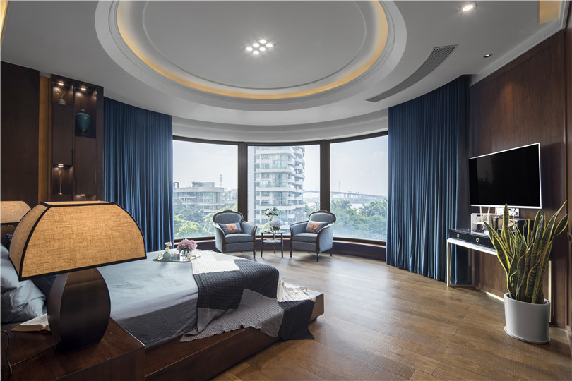 270°落地窗是主臥的亮點,搭配藍色天鵝絨的窗簾,無論白天還是夜晚,這里都時時透露著典雅與時尚。