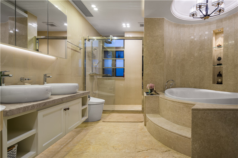 大理石打造出的圓形浴缸區(qū)域是衛(wèi)生間的重頭戲,配以兩個恰到好處的壁龕,營造出奢華與浪漫的氛圍。