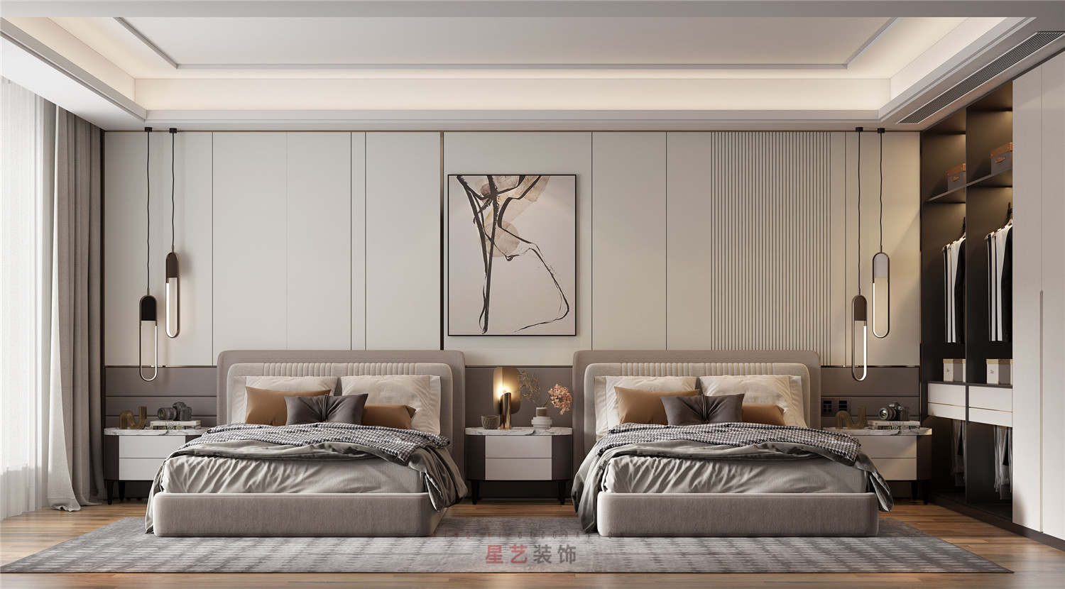 主臥用大面積灰調(diào)與對稱的設(shè)計,沉穩(wěn)高級。簡約之中,又有無盡的雅致與濃厚的生活氣息。