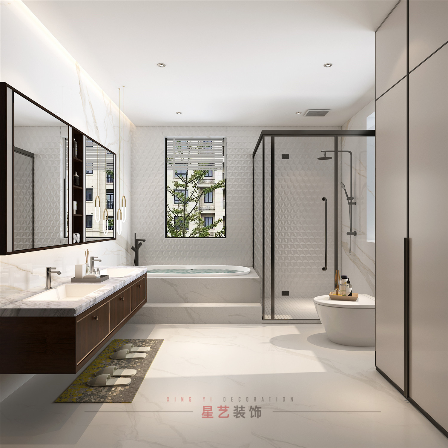 主衛(wèi)用統(tǒng)一的白色色調(diào)擴大了視覺空間,看起來更加干凈整潔,搭配黑色描邊增加時尚氣息,純碎而含蓄。
