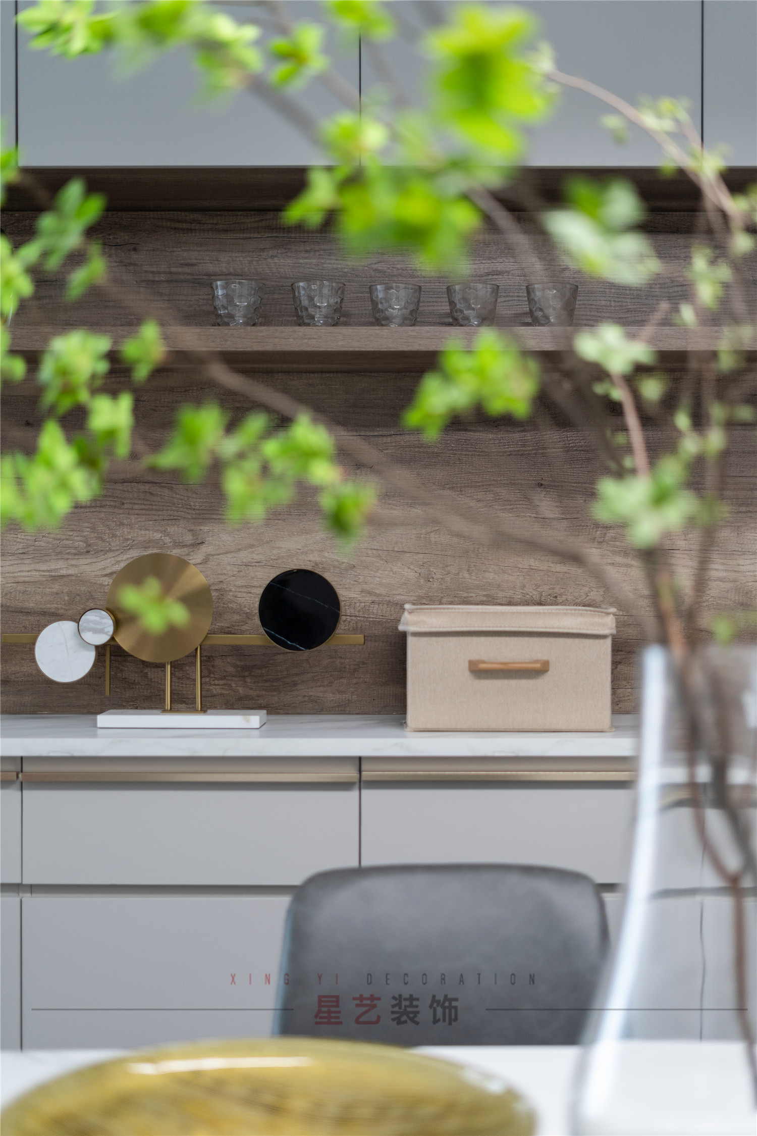 煥然一新的用餐區簡約清新,整面的置物柜中間設置置物臺,最常用的東西都方便觸手可得,也可以放喜愛的擺件,整體沒有繁復的設計,只有最貼近人間煙火的靜謐氣息。