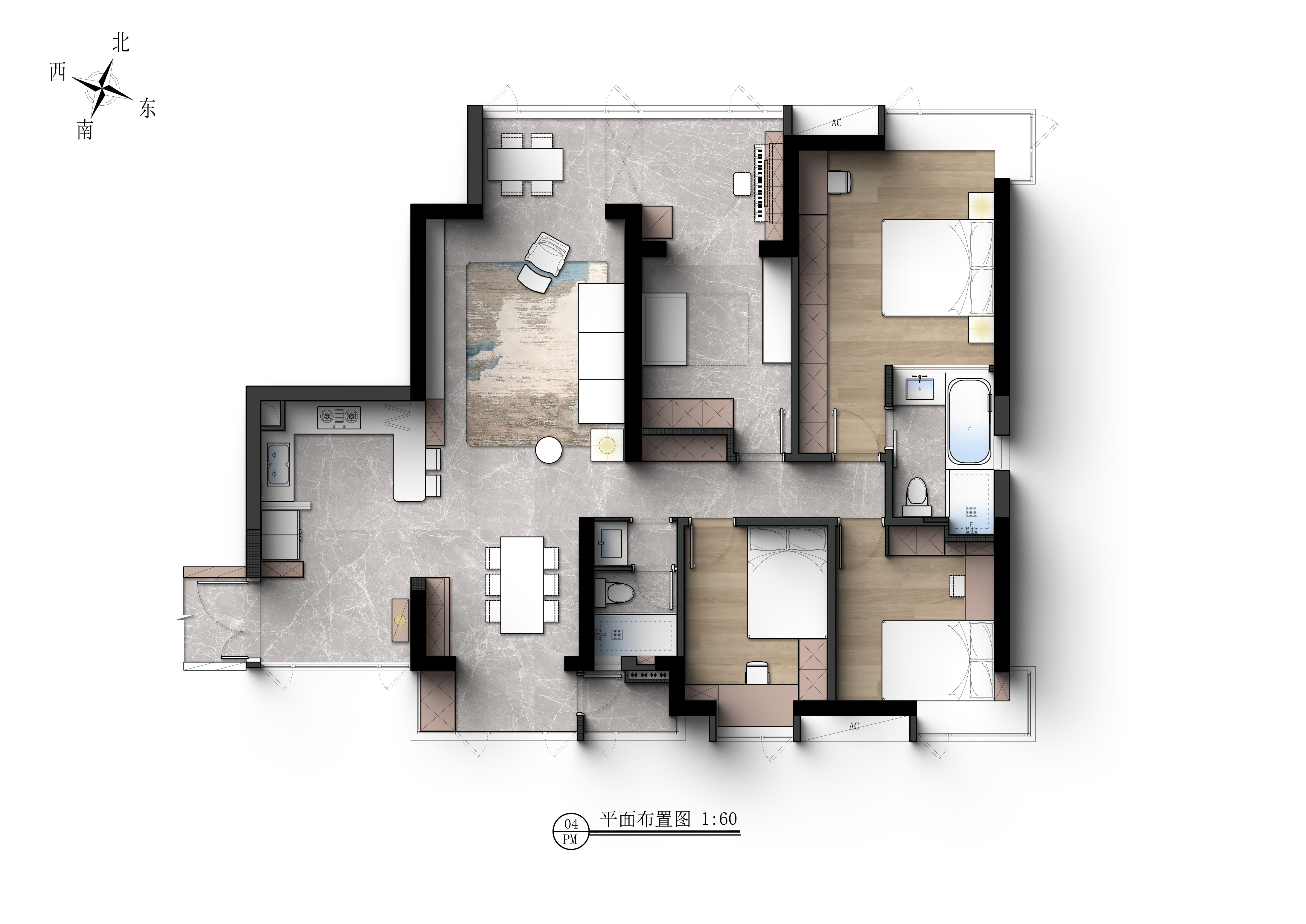 進入玄關(guān),海潮般的大理石紋理映入眼簾, 結(jié)合深咖色亞克力櫥柜,一動一靜恰到好處,日光透過紗簾傾瀉而下,將世界囿于地面,靈動舒揚,捎來生活的囈語。
