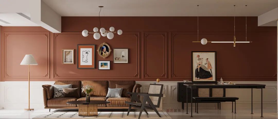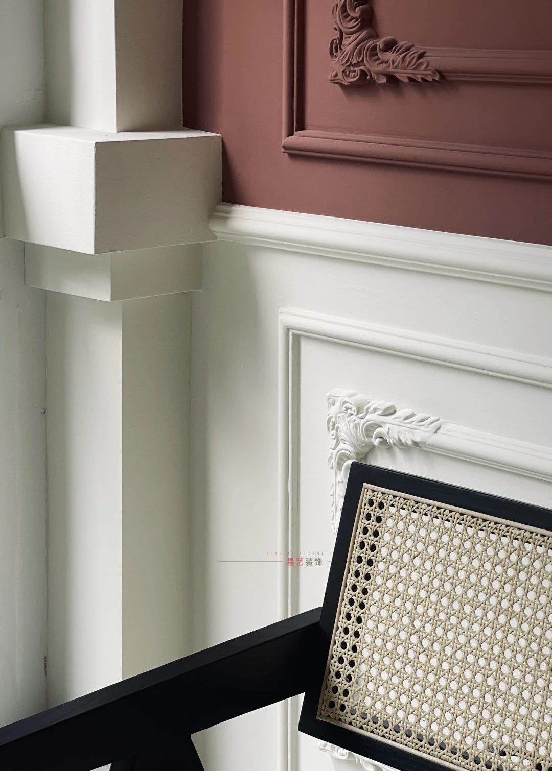 提到法式風(fēng)格,就繞不開石膏線條元素,大開大放、如火如荼的大繎色塊游走整個(gè)客餐區(qū),毫不遮掩展示了主人熱情的性格,同時(shí)達(dá)到了延伸、整合的作用。