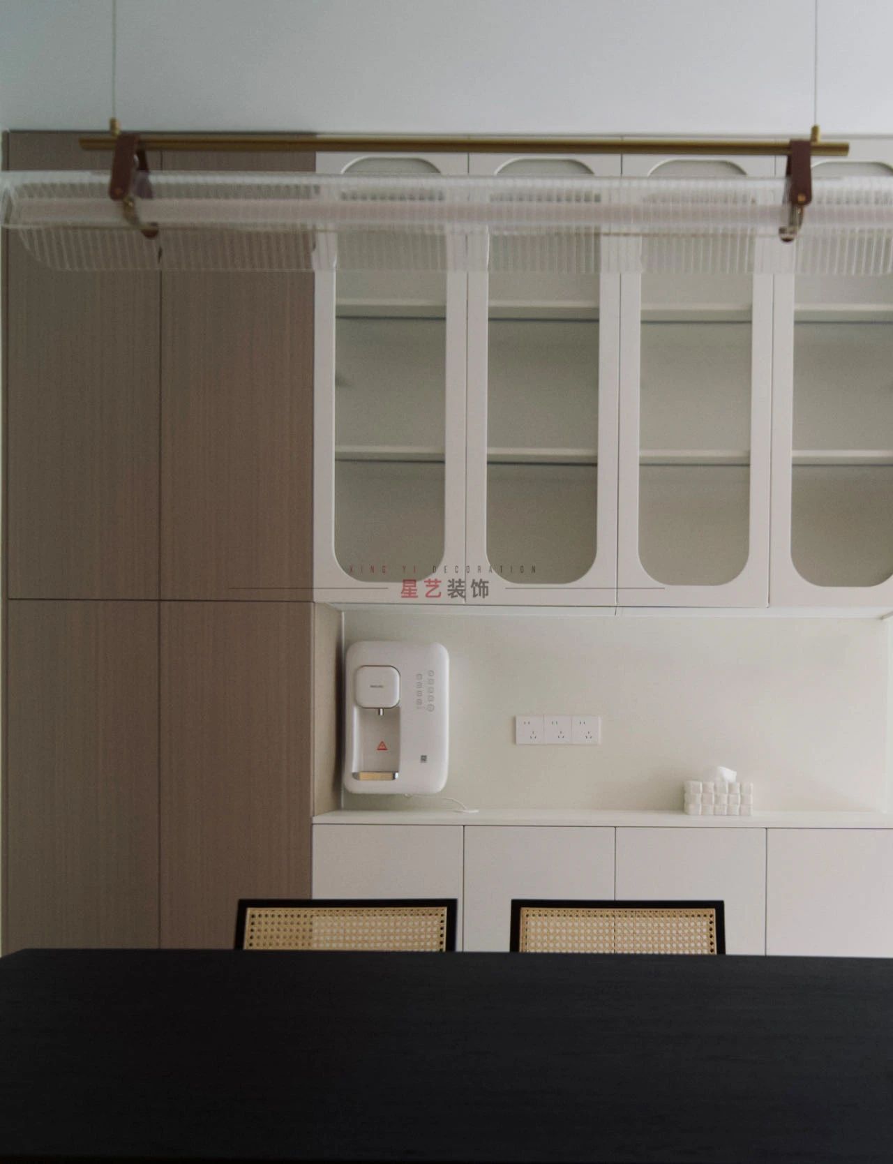 餐桌旁幾乎一整面墻的儲物柜,純白色弱化了存在感,中間留了開放格,可以放小型的咖啡機(jī)和常用物品。