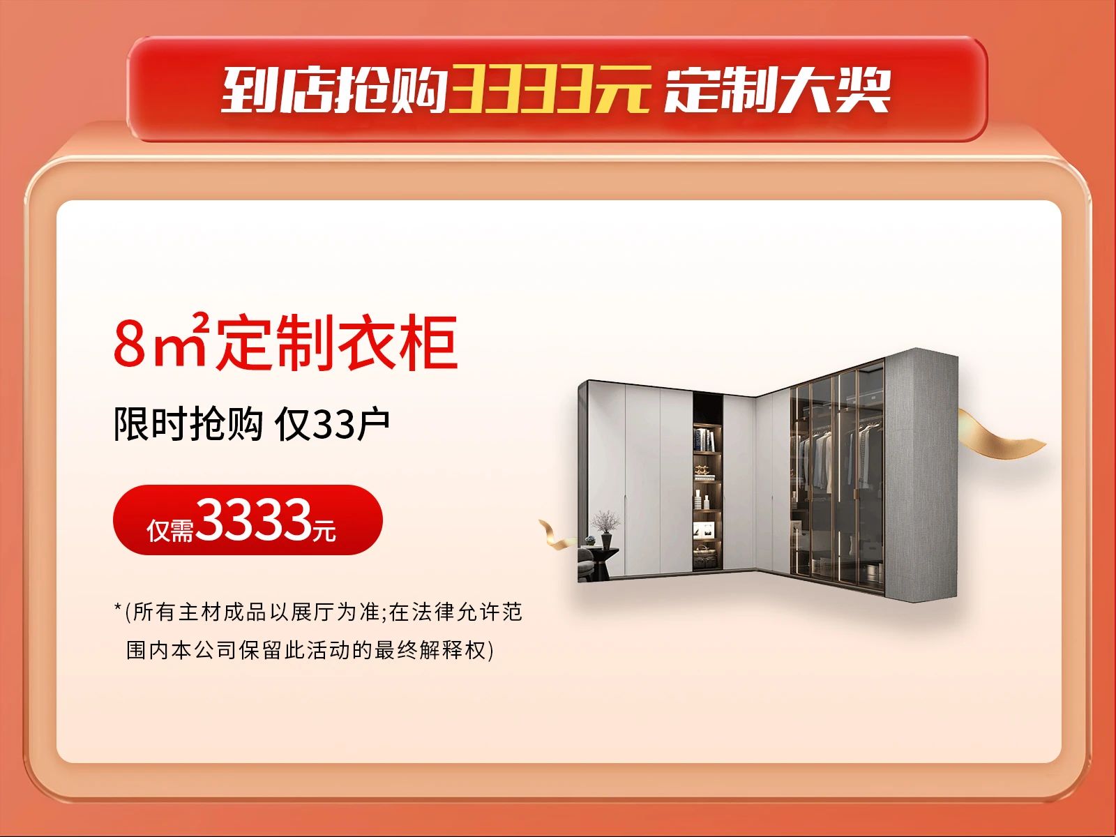 為慶祝星藝33周年活動,現(xiàn)推出3333元搶購8㎡定制衣柜,限時限量,有裝修需求的小伙伴抓緊時間啦!
