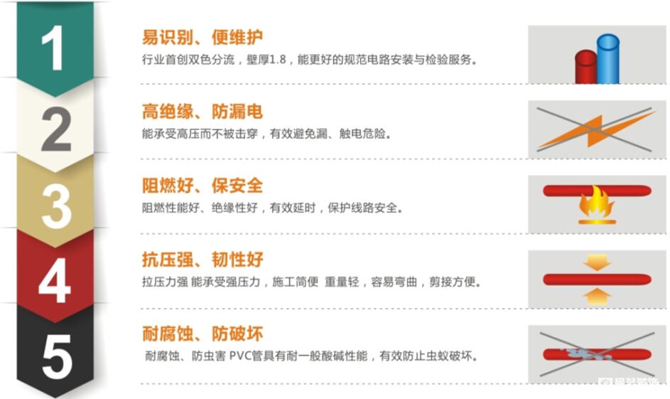 行業(yè)首創(chuàng)雙色電工套管,根據(jù)星藝裝飾標(biāo)準(zhǔn)工藝的要求為了更好的規(guī)范電路工程,確保工程品質(zhì),及監(jiān)理與業(yè)主對(duì)電工項(xiàng)目的檢查與驗(yàn)收,采用優(yōu)質(zhì)的阻燃型有色PVC塑料管作強(qiáng)、弱電線保護(hù)管材。紅色——強(qiáng)電及照明用電專用,藍(lán)色——弱電項(xiàng)目專用。